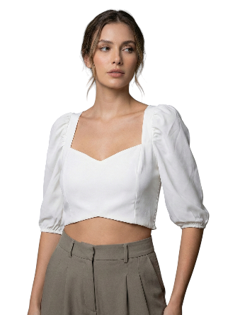 La blusa es super coqueta. Los hombros descubiertos le dan ese toque femenino que buscaba. Las mangas acampanadas le quedan perfectas.
