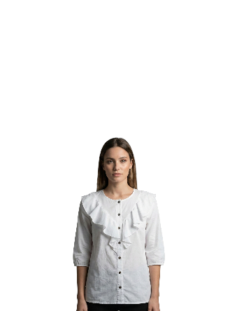 Blusa blanca de algodón–lino con volantes y botones oscuros, fresca y femenina para cualquier ocasión.