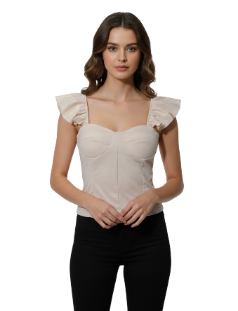 Top corsé beige con volantes, femenino y moderno para elevar cualquier look sin esfuerzo.